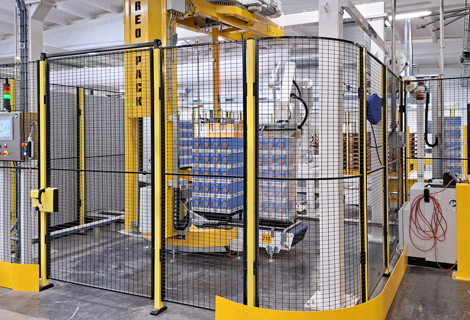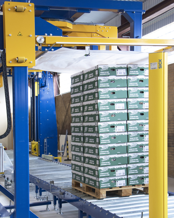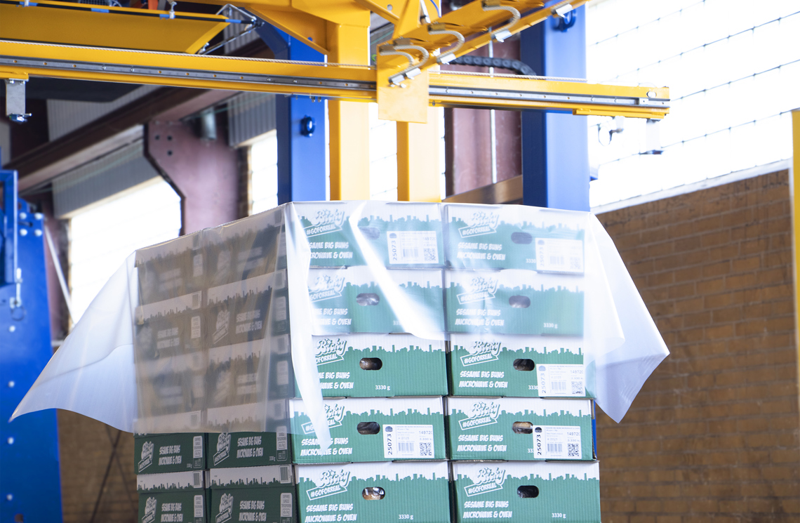 A R2000 top applicator is a sheet placer. It is a standalone machine but can be integrated, typically, alongside our S1500, S3000, and J2000 stretch wrappers.