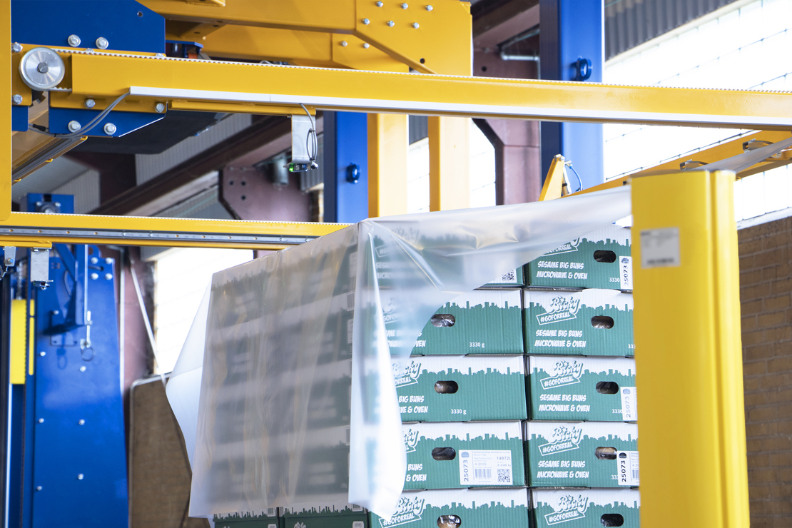 Subsequently, the knife cuts the foil, and the fingers then stretch the foil over the pallet with products, placing it in the center over the pallet.