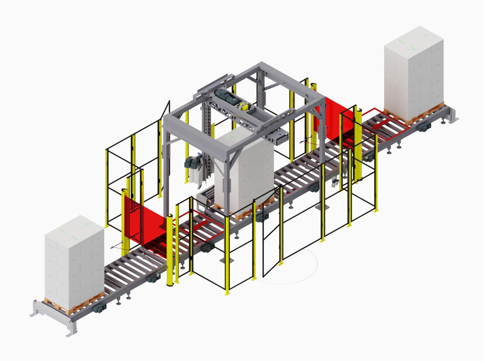 A S1500 stretch wrapper, where the pallet remains stationary during the wrapping process. Options can be customised for the stretch wrapper to fit the surroundings and the requirements of stretch wrapping.